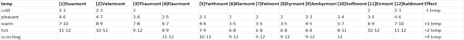 The players in my campaign are heading north from Thyatis up to Ylaruam and I'm in need of a new weather generator for the desert climate. I increased the chance of thunderstorms during rain. For the moment, until I do more in depth analysis, I'm applying a dominant wind from the North with a -3 applied to wind speeds; this is due to a high pressure zone over Ethengar which would expand in the summer months over the altan tepes in rockhome(based on my wind pattern map). For those regions near the mountains, the wind would be coming off them, either from the west, or the south, depending on location. Basically Ylaruam is surrounded by high pressure zones over the altan tepe mountains and the wind comes from all directions to meet in the lowlands, driving away any moisture from the sea to the east. So as much as many in the fan community might think ylaruam shouldn't be a desert, the presence of high pressure from the mountains and its latitude actually makes the presence of a desert reasonable. Though this is based on my own educated guesswork, I have yet to make an accurate simulation of winds and currents that would really show this definitively.
